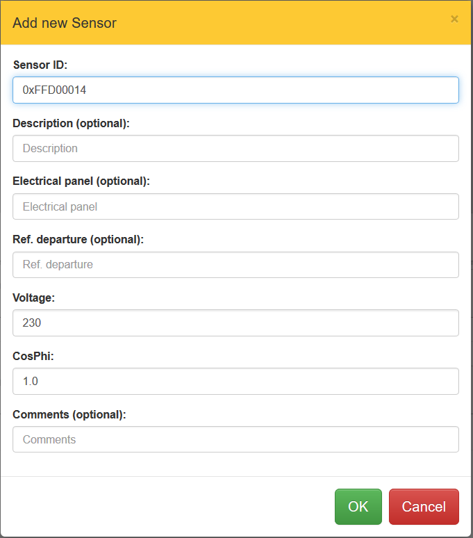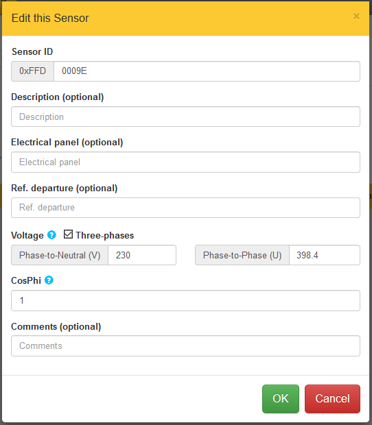 3. Complete Sensor ID field. Voltage and CosPhi parameters are pre-completed, but it is of course possible to update them.
